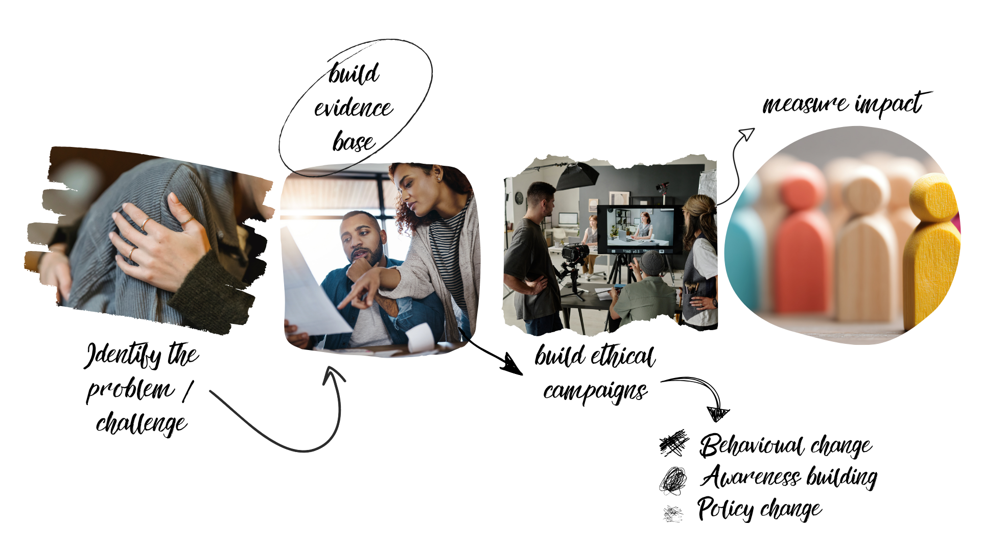 We bring together expert researchers, policy strategists, and people directly affected by the issues to co-create research, strategies, and campaigns that go beyond awareness and into action. We fuse research, strategy, behavioural science, and creativity to solve complex social problems. Building insight-driven campaigns, training, and interventions that make a lasting difference.